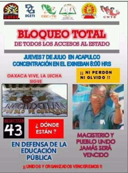 En una convocatoria que difundieron por las redes sociales, los cetegistas informaron que "habría bloqueo total" por lo ocurrido en Oaxaca, este jueves siete de julio, además de seguir con la lucha contra la Reforma Educativa, lo que no ha sido desmentido por las autoridades de la Secretaría de Educación Guerrero (SEG).