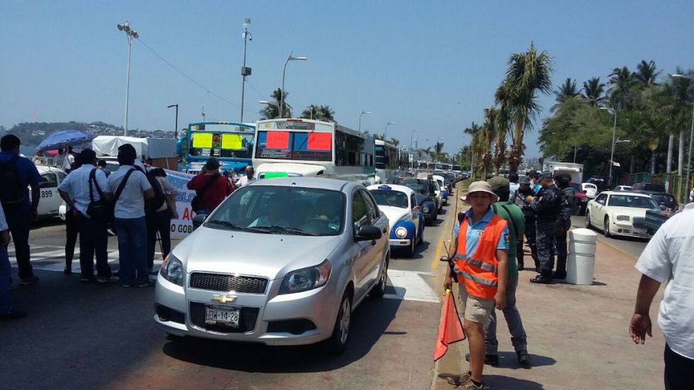 Transportistas de Acapulco, liderados por el dirigente del Bloque Uno del Transporte Urbano de Acapulco, Jesús Catallán Martínez, se manifiestan en la costera "Miguel Alemán", a la altura del Asta Bandera, donde mostraron su rechazo al Acabús, el cual iniciará operaciones en mayo próximo.