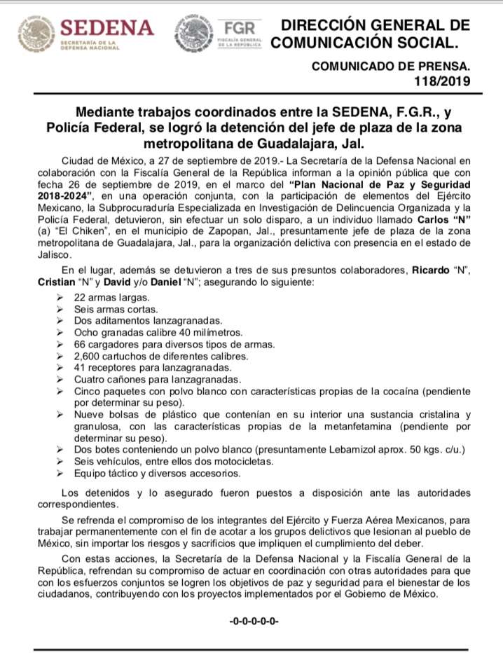 ZAPOPAN, Jalisco.- 27 septiembre 2019.- La Secretaría de la Defensa Nacional en colaboración con la Fiscalía General de la República informó que en el marco del ’Plan Nacional de Paz y Seguridad 2018-2024’, en una operación conjunta, con la participación de elementos del Ejército Mexicano, la Subprocuraduría Especializada en Investigación de Delincuencia Organizada y la Policía Federal, detuvieron, sin efectuar un solo disparo, a un individuo llamado Carlos ’N’ (a) ’El Chiken’, en el municipio de Zapopan, Jal., presuntamente jefe de plaza de la zona metropolitana de Guadalajara, para la organización delictiva con presencia en el estado de Jalisco.