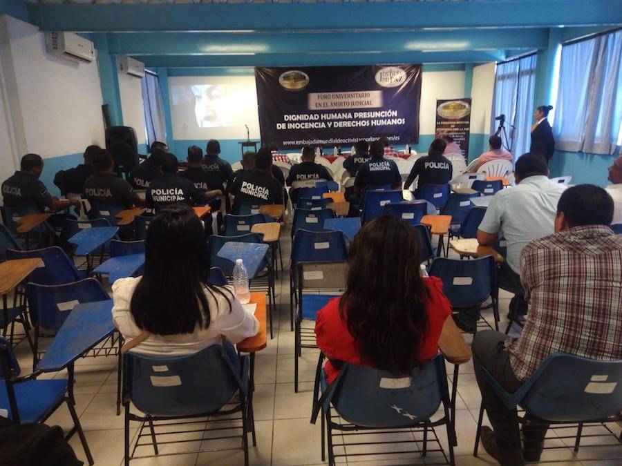 En el marco de la capacitación que reciben los elementos de la Secretaría de Seguridad Pública, integrantes de la Embajada Mundial de Activistas por la Paz, impartieron la conferencia “Dignidad Humana, Presunción de Inocencia y Derechos Humanos”.