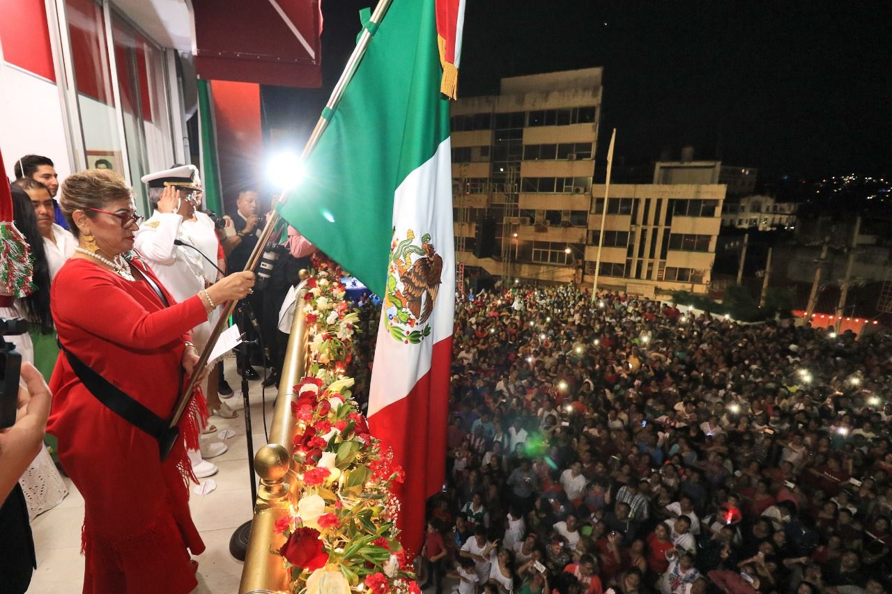 Desde el balcón del Ayuntamiento del centro, minutos antes de las 11 de la noche, acompañada de representantes de las Fuerzas Armadas y autoridades de los diferentes niveles de gobierno, la presidenta municipal, Adela Román Ocampo, realizó el grito de ¡viva México!, en la ceremonia del Grito de Independencia, tocó la campana y ondeo el lábaro patrio, generando algarabía entre los cientos de asistentes.