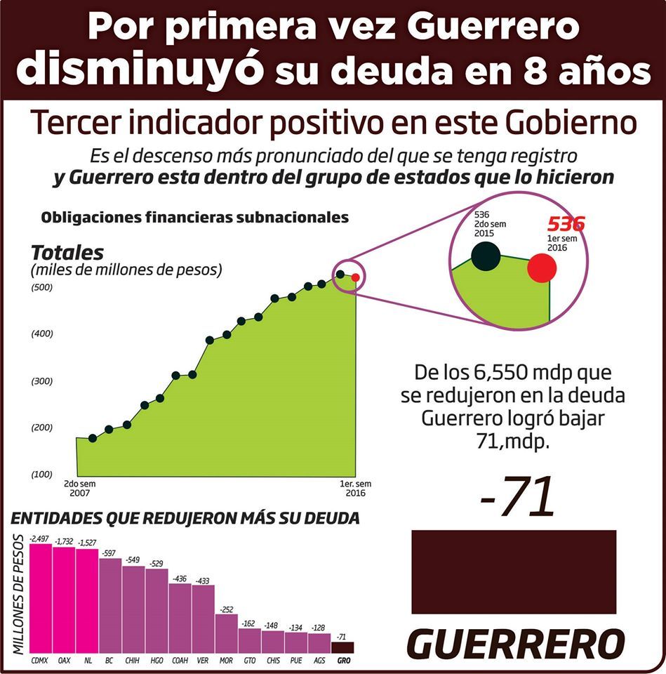 El gobernador del estado, Héctor Astudillo Flores, informó que de acuerdo a datos proporcionados por la Secretaría de Hacienda y Crédito Público (SHCP), Guerrero disminuyó su deuda pública durante el primer semestre de este 2016.