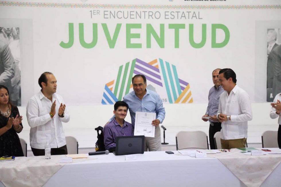 El gobernador clausuró este lunes en Casa Guerrero el Primer Encuentro Estatal de la Juventud, donde entregó un reconocimiento y un apoyo económico de 50 mil pesos al estudiante Félix Ortiz Carreón, originario de Iguala y premio Nacional de la Juventud, quien sufre de parálisis cerebral y en sus extremidades inferiores, y no obstante estudió ingeniería en Computación y ahora su maestría.