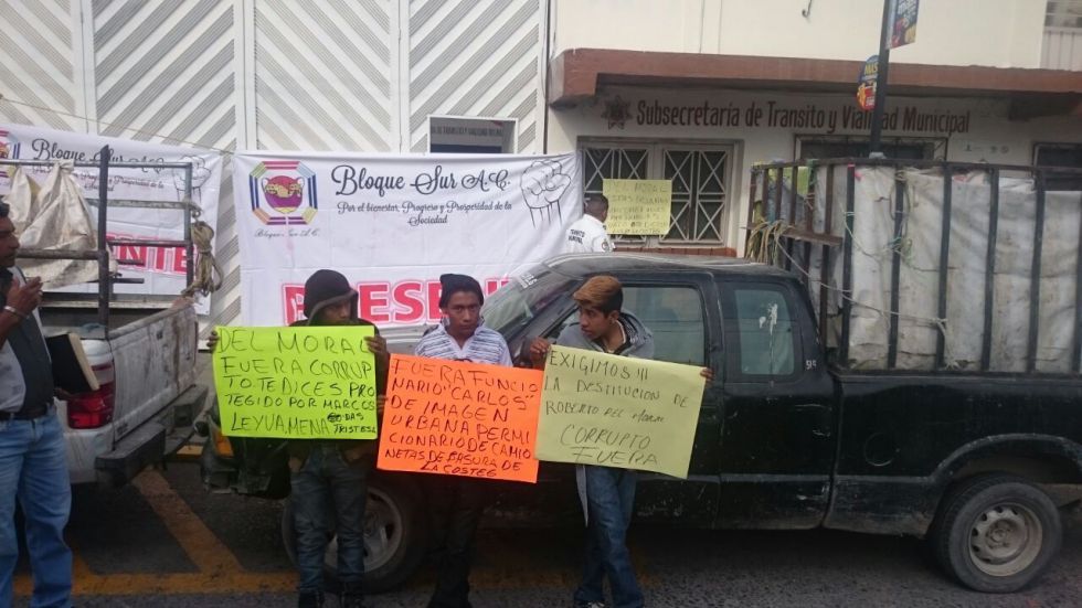 Dijeron que ya están hartos de la corrupción que impera en Tránsito Municipal, lo que es solapado por el alcalde Marco Antonio Leyva (MAL), quien ’se hace de la vista gorda’ y solapa al subsecretario Roberto del Moral Benítez, quien sólo busca llenar sus bolsas de dinero ignorando a la población, por lo que urgieron su destitución o advirtieron que radicalizarán sus acciones de protesta hasta lograr que deponga el cargo.(www.agenciairza.com)