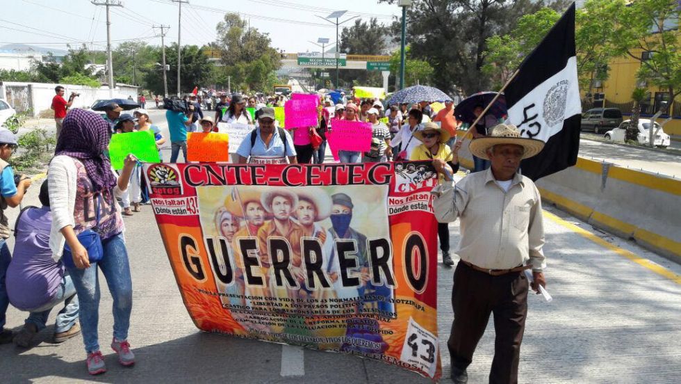 Los manifestantes partieron de la avenida Insurgentes y tomaron como punto de encuentro la estatua de Vicente Guerrero -El Caballito-, al norte de la ciudad, y de ahí partieron por la vía federal haciendo una parada en el Congreso del Estado, en donde una comisión encabezada por Ramos Guerrero y Carlos Botello Barrera se reunió con la presidenta de la Comisión de Gobierno, la diputada Flor Añorve Ocampo, a quien le entregaron un pliego petitorio en que destacan la exigencia de la aparición con vida de los 43 estudiantes de Ayotzinapa y la abrogación a la Reforma Educativa.