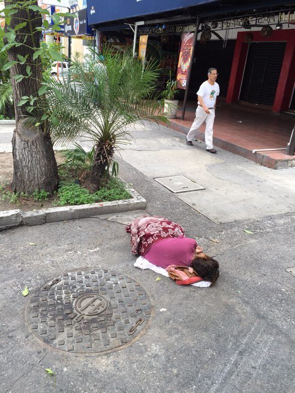 En un recorrido por las principales calles del puerto, se observó a una anciana moribunda recostada en una acera. La imagen que pareciera de película, se pudo ver en plena Costera. a la altura del Centro Comercial Galerías Acapulco. Según testigos, desde hacía varios días padece hambre y sed, por lo que creen que lo único que esperan es la muerte.