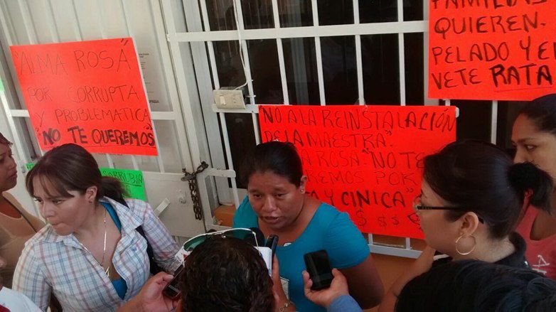 Con mensajes escritos a mano, las mujeres escribieron y reprocharon: "No a la reinstalación de la maestra Alma Rosa. No te queremos por Rata Cínica"; "Aquí no hay dinero. Sólo hay padres de familia que no te quieren. Quieres pelado y en la boca. Vete rata mañosa", entre otros.