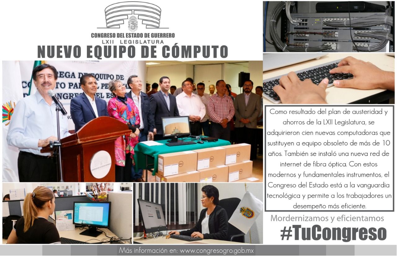 Gracias a los ahorros por la austeridad republicana, el Congreso del Estado de Guerrero que preside Antonio Helguera Jiménez, entregó 100 nuevas computadoras y renovó en su totalidad, la red de Internet con fibra óptica, lo que reemplazó la anterior que llevaba más de 10 años, y que estaba obsoleta, por lo que con estas acciones mejorará la atención a la ciudadanía por parte de los diputados de la 62 Legislatura.
