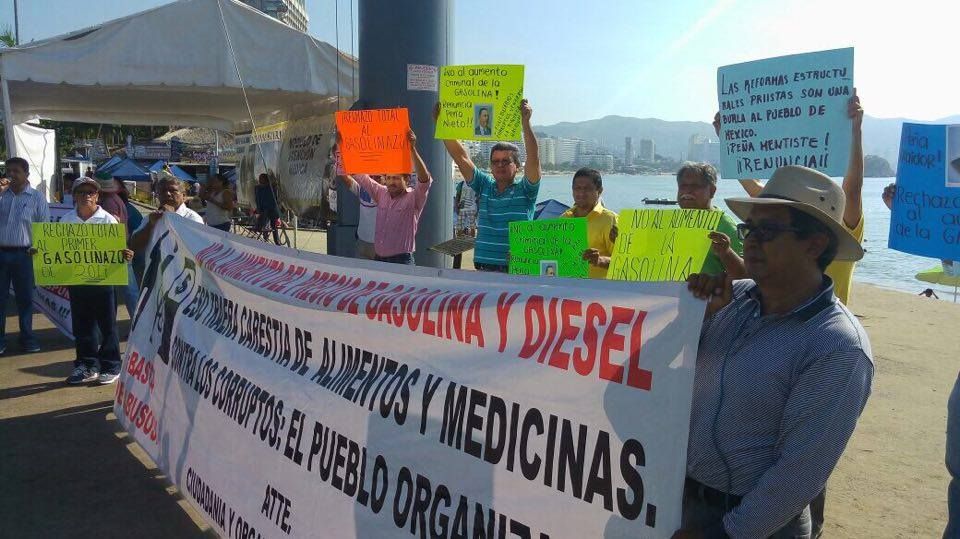 En Acapulco, medio centenar de militantes del Partido del Trabajo (PT) se manifestaron en uno de los costados de la Glorieta de la Diana Cazadora, que se localiza en la zona turística de Acapulco, en el punto en el que convergen la avenida costera y la Farallón, donde rechazaron el incremento en el precio de la gasolina, gas y energía eléctrica, y exigieron al presidente Enrique Peña Nieto, que dé marcha atrás en esta decisión que afecta severamente la economía de millones de familias en todo el país.