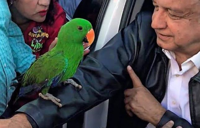 Y llegando a Torreón, AMLO se vio sorprendido con un inesperado regalo de una señora que esperaba por su llegada, un PERICO.