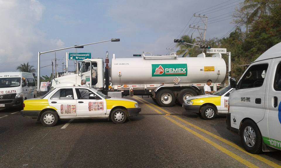 (IRZA).- Operadores de taxis colectivos de ruta retuvieron un carro tanque de combustible propiedad de Petróleos Mexicanos (Pemex), con el cual bloquearon totalmente la circulación en la carretera federal hacia el Centro de esta ciudad porteña y hacia Ixtapa-Zihuatanejo, como protesta por el incremento en el precio de los combustibles.