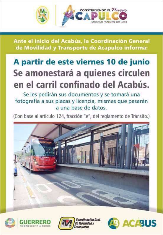 En el anuncio publicado en las redes sociales y diversos medios de comunicación del Ayuntamiento porteño, se leía que ’la Dirección General de Movilidad y Transporte informa que a partir del viernes 10 de junio, se amonestará a quienes circulen por el carril confinado del Acabús, a quienes se les requerirá documentación y se tomarán fotografías de sus placas y licencia, las cuales pasarán a una base de datos que determinarán la sanción correspondiente’, sin embargo, nada de eso sucedió.